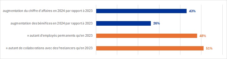 En termes de bénéfices, seul un professionnel sur quatre signale une augmentation en 2024 par rapport à 2023. 16% signalent une baisse de bénéfices. Pour 2025, peu de professionnels s’attendent à une augmentation par rapport à 2024. 23 % s’attendent à ce que les bénéfices restent les mêmes qu’en 2024. 14 % s’attendent à une diminution des bénéfices.